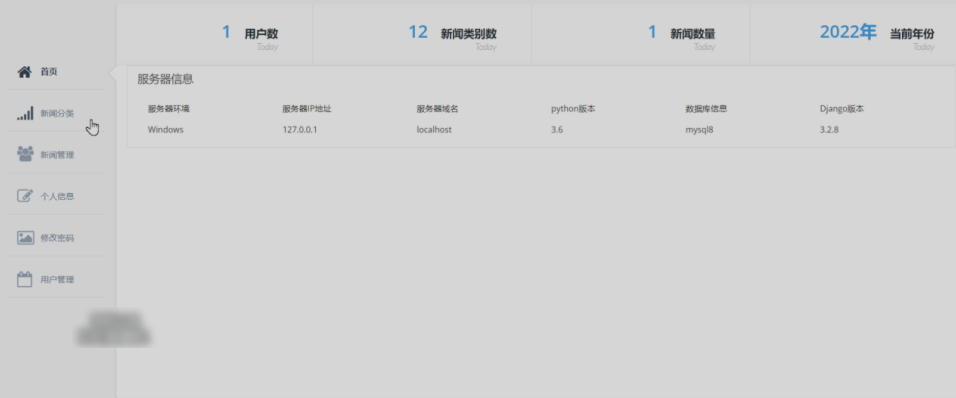 新闻分类界面的首页展示如下,在分类系统中,有首页、新闻分类、新闻管理、个人信息管理等内容模块,在首页中可以看到当前系统中的一些基本信息内容,包括当前系统中的用户数量、新闻类别数量、新闻数量以及当前的年份等信息