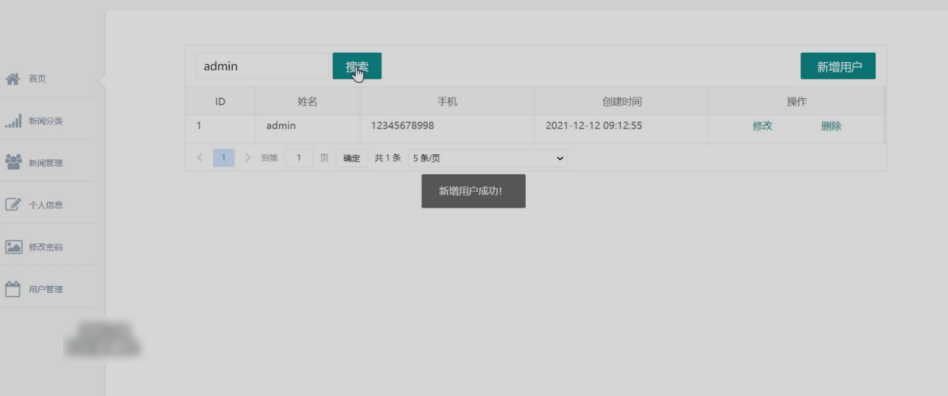 在用户管理界面中,可以看到现在系统中已经存在的用户信息,对于存在的用户信息可以进行在线修改,也可以添加新的用户,该功能模块中可以实现用户名的搜索