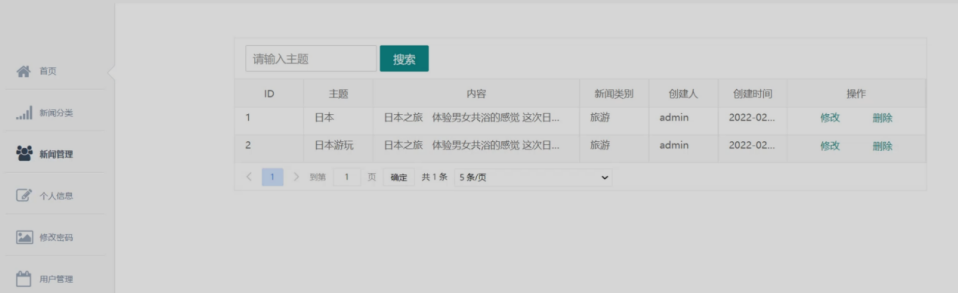 在新闻管理界面中,已经分类过的新闻信息将以列表的形式展现在该模块中,在新闻管理的主界面中可以看到有主题、有分类的内容、有新闻的分类类别,新闻的创建人等。