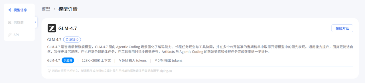 | GLM-4.7 | 智谱AI | 长文本理解、编码能力强 | 技术文档处理、代码生成、学术研究 |