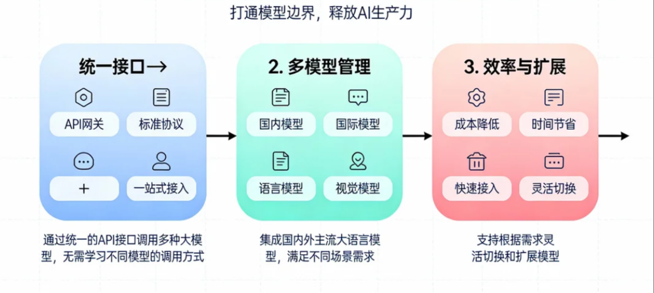 在AI技术快速发展的今天,市场上涌现出众多优秀的大语言模型,如GLM-4.7、MiniMax-M2.1、通义千问等。然而,每个模型都有自己的API接口和调用方式,开发者需要花费大量时间学习和适配不同模型,这大大增加了开发成本和复杂度。