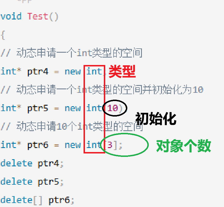 3、malloc申请空间时,需要手动计算空间大小并传递,new只需要在其后跟上空间的类型即可,如果是多个对象,[]中指定对象个数即可