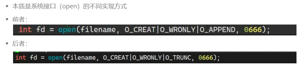 O_TRUNC :若文件存在则清空内容;O_APPEND :写入时始终追加到文件末尾