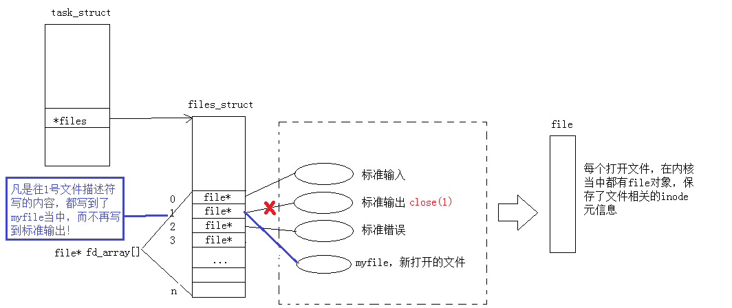 当标准输出被关闭时,我myfile就会使用1这个下标,作为其文件描述符(注意要先关闭标准输出,然后再创建myfile)
