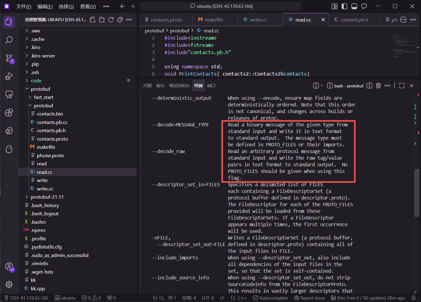 在调试阶段,若无法查看程序源码但持有 .proto 定义,可使用编译器自带的解码功能。