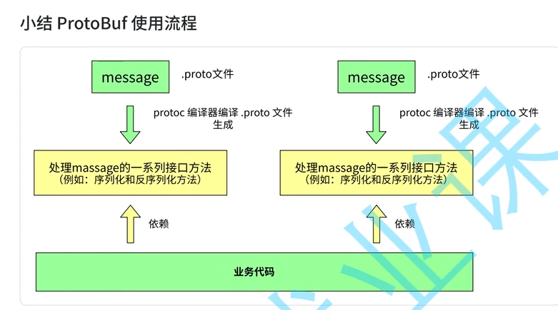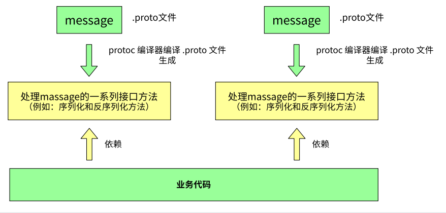 如图所示,开发流程首先从 .proto 文件开始,通过 protoc 编译器将定义的 message 结构翻译为目标语言的源代码。