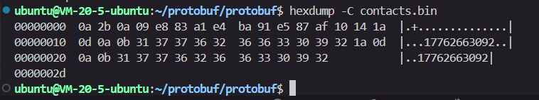 利用 Linux 系统的 hexdump 命令,可以观察到 Protobuf 序列化后的物理存储形式。