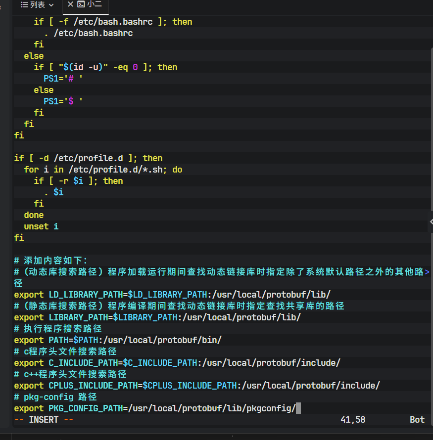 /etc/profile文件,配置库搜索路径与包含路径:bashsudo vim /etc/profile # 添加内容如下: export LD_LIBRARY_PATH=$LD_LIBRARY_PATH:/usr/local/protobuf/lib/ export LIBRARY_PATH=$LIBRARY_PATH:/usr/local/protobuf/lib/ export PATH=$PATH:/usr/local/protobuf/bin/ export C_INCLUDE_PATH=$C_INCLUDE_PATH:/usr/local/protobuf/include/ export CPLUS_INCLUDE_PATH=$CPLUS_INCLUDE_PATH:/usr/local/protobuf/include/ export PKG_CONFIG_PATH=/usr/local/protobuf/lib/pkgconfig/