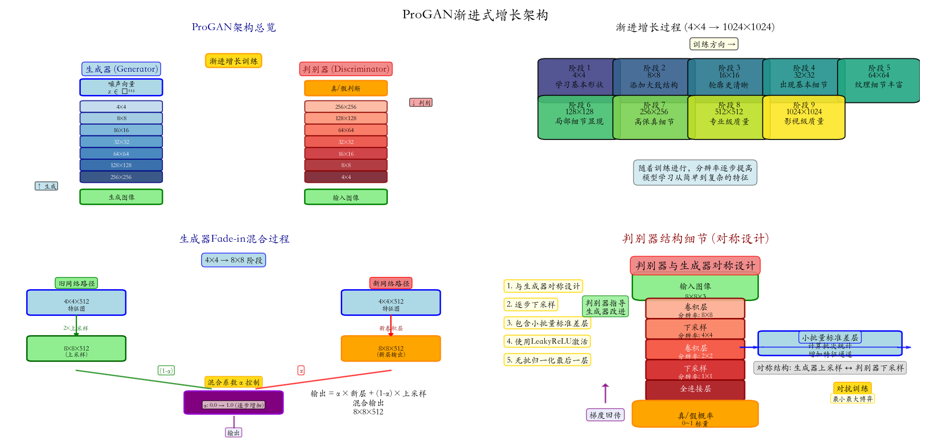 ProGAN (Progressive Growing of GANs)由Tero Karras等人于2017年提出,是首个能够稳定生成1024×1024高分辨率图像的生成对抗网络。在它之前,生成高分辨率图像如同攀登珠峰,既危险又困难;在它之后,高分辨率图像生成成为标准配置。