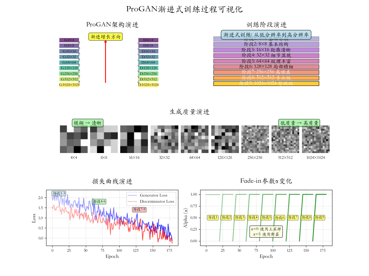渐进训练算法核心思想:逐步增加复杂度,每次只学习当前分辨率下的特征分布,稳定后增加分辨率继续学习更精细的特征。