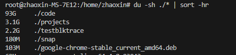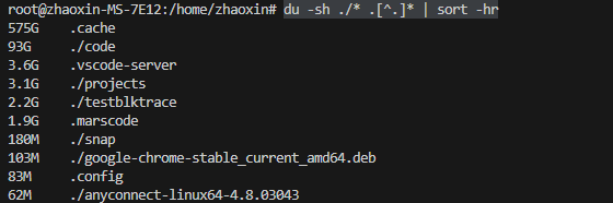 而再到/home/zhaoxin目录下去查看哪个文件夹占了很多磁盘空间,就找不到了: