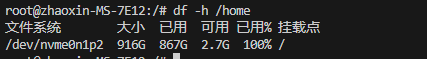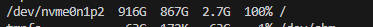 通过df -h可以查看到根文件系统对应的/dev/nvme0n1p2这个盘符的磁盘空间已经所剩无几了: