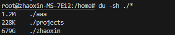 到/home下,再通过du -sh去看是哪个文件夹占用这么多,可以如下图看到是/home目录占了679g: