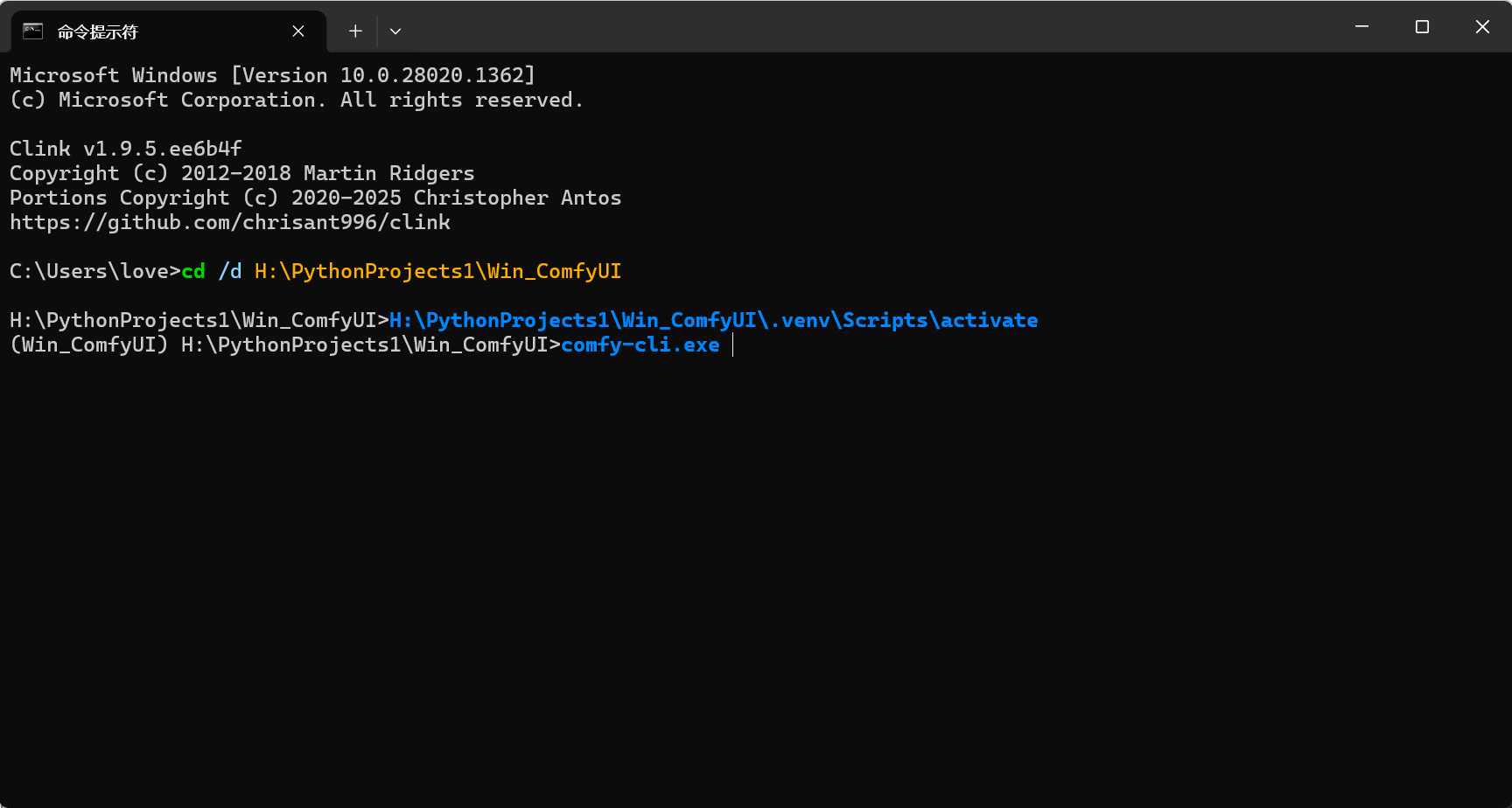 1\] Clink 官网 [https://chrisant996.github.io/clink/](https://chrisant996.github.io/clink/ "https://chrisant996.github.io/clink/") \[2\] comfy-cli 官方文档 [https://docs.comfy.org/comfy-cli/getting-started](https://docs.comfy.org/comfy-cli/getting-started "https://docs.comfy.org/comfy-cli/getting-started") \[3\] click-completion 源码(查看支持 Shell 列表) [https://github.com/click-contrib/click-completion](https://github.com/click-contrib/click-completion "https://github.com/click-contrib/click-completion")
