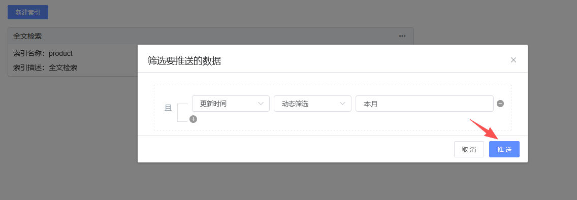 3、配置后需要推送数据到搜索引擎中,回到索引管理界面,点击推送按钮,如下图: