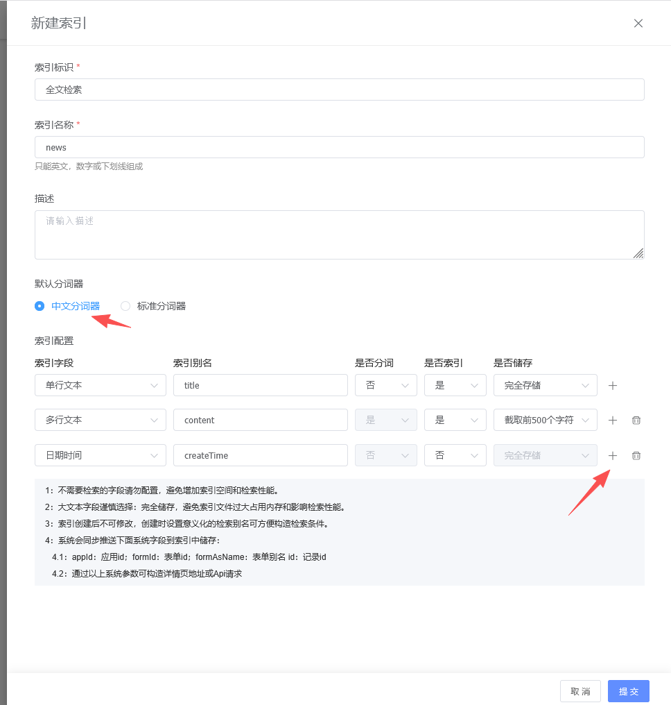 1:不需要检索的字段请勿配置,避免增加索引空间和检索性能。