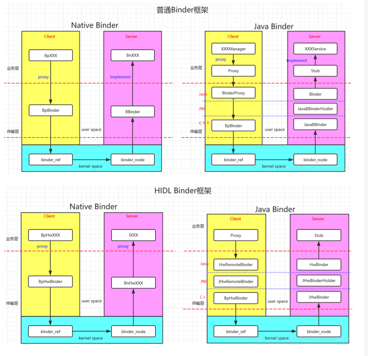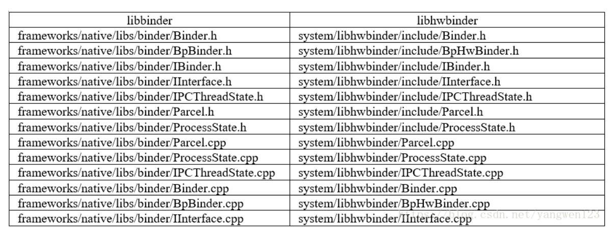 实际的开发以及后续的源码分析,我更多接触的是应用层库 libhwbinder.so,这个库基本就是 libbinder.so 库的翻版: