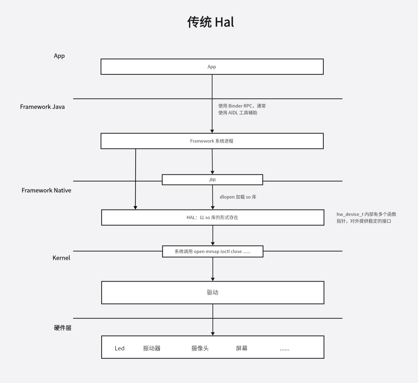 - 部分 HAL 在使用上有性能要求,使用 HwBinder RPC 访问性能不够看,这样 Framework 分区的程序就需要通过链接 Vendor 中的 Hal so 库来直接使用 HAL。