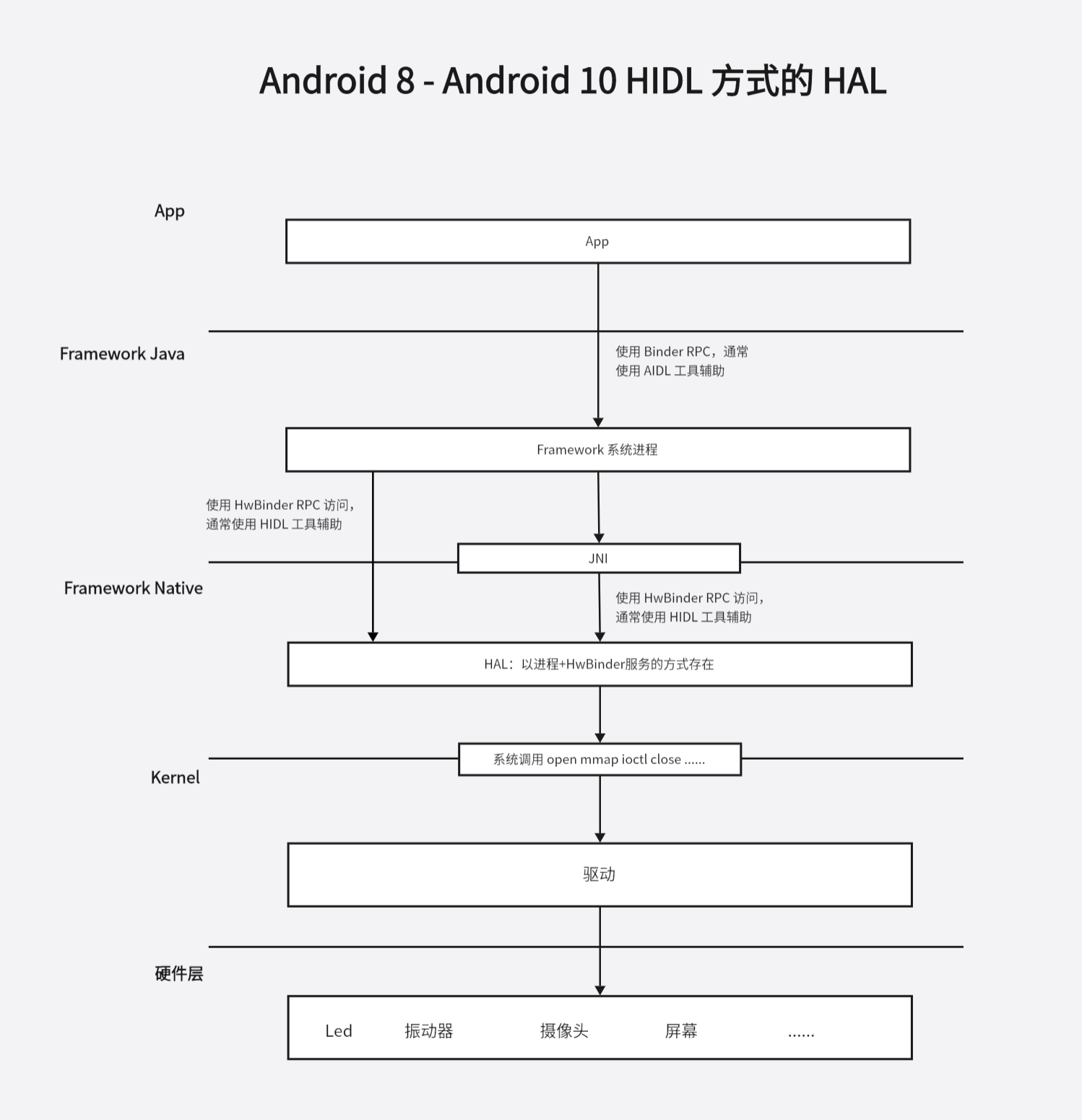 - Framework 层通过 HwBinder RPC 调用访问 Vendor 中的 HAL 进程。