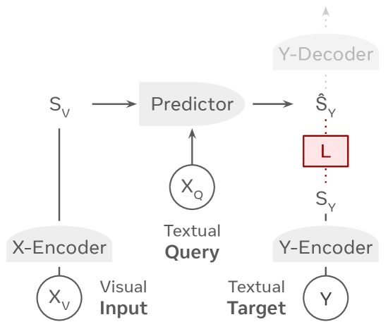 我们提出了VL-JEPA(图1),这是一种用于视觉语言任务的具有联合嵌入预测架构(JEPA)的模型。 VL-JEPA 使用三元组\((X_V,X_Q,Y)\)