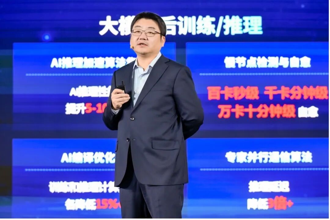第三,在推理场景,针对RoCE网络在规模化部署中的痛点进行了重点优化。随着国内RoCE网络比例从2024年到2025年实现反超,万全4.0创新性地解决了四台机器以上RoCE网络带宽指数级下降的行业难题,实现了带宽利用率提升60%,通信原语性能提升30%,大模型推理性能提升30%的效果。