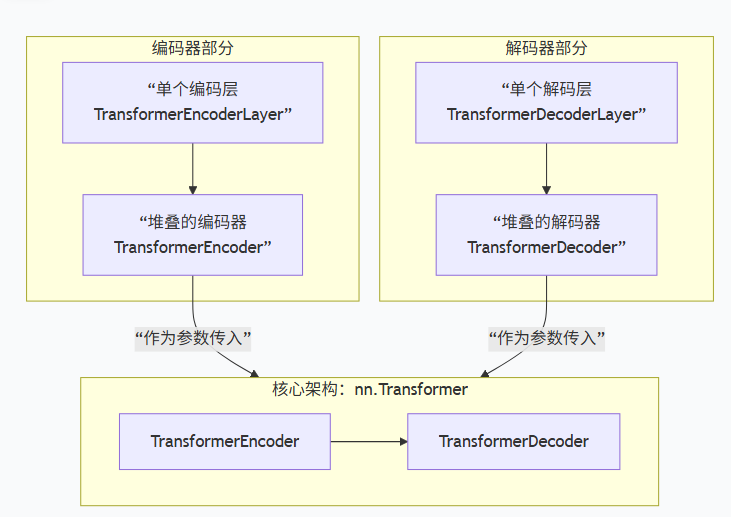 顶层nn.Transformer类 :这是你通常直接调用的类。在初始化时,你需要传入定义好的编码器和解码器(或指定层数由内部自动创建),并通过