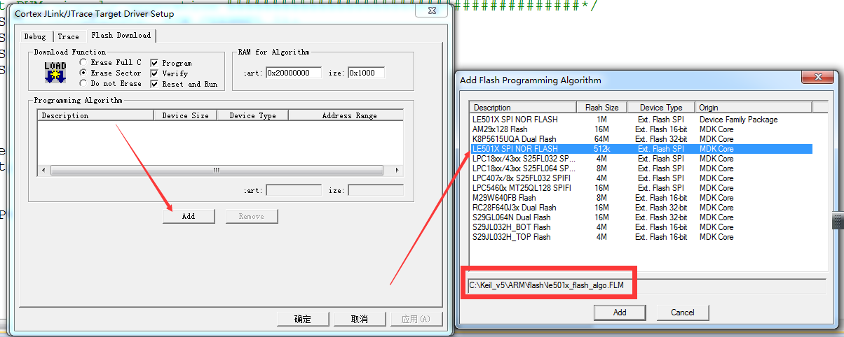 针对这个LE501x芯片这个文件告诉 Keil:怎么通过 J-Link 操作外部 SPI Flash。按照下面图示添加这个文件,在添加前需要将安装包里的le501x_flash_algo.elf 文件复制一份并修改文件名为le501x_flash_algo.FLM,并将le501x_flash_algo.FLM文件拷贝到keil安装目录下的 ARM\Flash 路径中。(按照LE501x的pack包的话可以替代上面这一步操作)