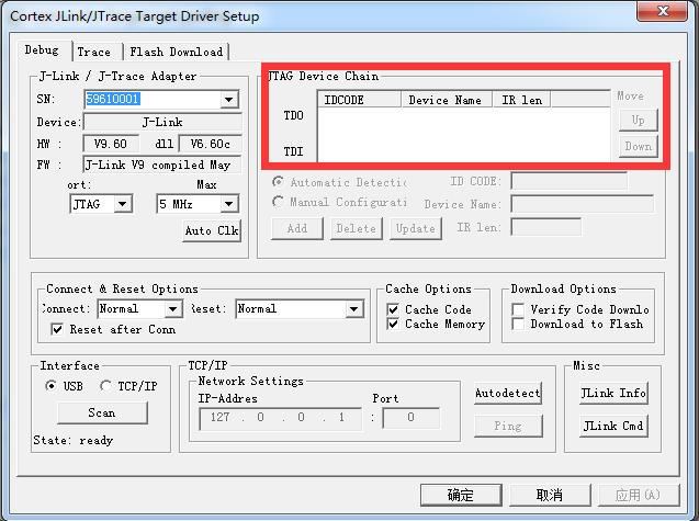 经排查是因为下图中这个JTAG Device Chain里没有识别到导致的,将JTAG改为SW后就能识别到了。