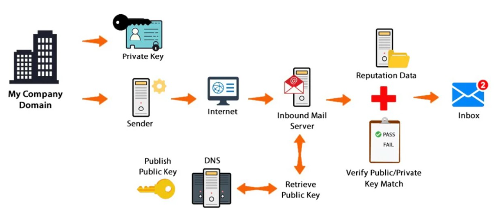 核心逻辑:发件方域名所有者生成非对称密钥对(私钥+公钥),用私钥对邮件核心内容签名,公钥通过DNS公开;收件方MTA通过DNS获取公钥,验证签名是否有效------签名有效则证明邮件内容未被篡改,且确实来自该域名的合法所有者。