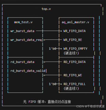 这样设计的好处是,你在编写其余的逻辑代码(比如 mem_test.v)时,完全不需要了解 AXI 协议的细节,只需要操作简单的 FIFO 和寄存器即可完成对 DDR 等高速存储器的读写。