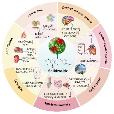1\] Song, T.; Wang, P.; Li, C.; et al. Salidroside simultaneously reduces de novo lipogenesis and cholesterol biosynthesis to attenuate atherosclerosis in mice. Biomedicine \& pharmacotherapy = Biomedecine \& pharmacotherapie **2021**, 134, 111137. \[2\] Chai, Y.; Chen, F.; Li, H.; et al. Mechanism of salidroside regulating autophagy based on network pharmacology and molecular docking. Anti-cancer drugs **2024**, 35 (6), 525-534. \[3\] Huang, X.; Xing, S.; Chen, C.; et al. Salidroside protects PC12 cells from Abeta1‑40‑induced cytotoxicity by regulating the nicotinamide phosphoribosyltransferase signaling pathway. Molecular medicine reports **2017**, 16 (3), 2700-2706. \[4\] Zhu, L.; Liu, Z.; Ren, Y.; et al. Neuroprotective effects of salidroside on ageing hippocampal neurons and naturally ageing mice via the PI3K/Akt/TERT pathway. Phytotherapy research : PTR **2021**, 35 (10), 5767-5780. \[5\] Lan, K. C.; Chao, S. C.; Wu, H. Y.; et al. Salidroside ameliorates sepsis-induced acute lung injury and mortality via downregulating NF-kappaB and HMGB1 pathways through the upregulation of SIRT1. Scientific reports **2017**, 7 (1), 12026. \[6\] Yang, L.; Yu, Y.; Zhang, Q.; et al. Anti-gastric cancer effect of Salidroside through elevating miR-99a expression. Artificial cells, nanomedicine, and biotechnology **2019** , 47 (1), 3500-3510. Lv, C.; Huang, Y.; Liu, Z. X.; et al. Salidroside reduces renal cell carcinoma proliferation by inhibiting JAK2/STAT3 signaling. Cancer biomarkers : section A of Disease markers **2016**, 17 (1), 41-47. \[7\] Liang, K.; Ma, S.; Luo, K.; et al. Salidroside: An Overview of Its Promising Potential and Diverse Applications. Pharmaceuticals (Basel, Switzerland) **2024**, 17 (12).