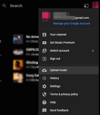 步骤二:在 YouTube Music 网页的主界面上,点击屏幕右上角的个人资料图标。然后会弹出一个菜单。从中选择"上传音乐"选项。