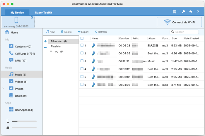 将音乐从Mac传输到Android最简单方法是使用Coolmuster Android Assistant 。它是一款专业的工具,可以帮助用户在Android和Mac之间传输文件,例如联系人、短信、通话记录、照片、视频、音乐、书籍、应用等等。使用它,您可以轻松地在Android和Mac之间选择性地传输文件。您还可以将Android数据备份到Mac ,并一键从Mac将备份恢复到Android 。您甚至可以在Mac上添加、删除和编辑文件。