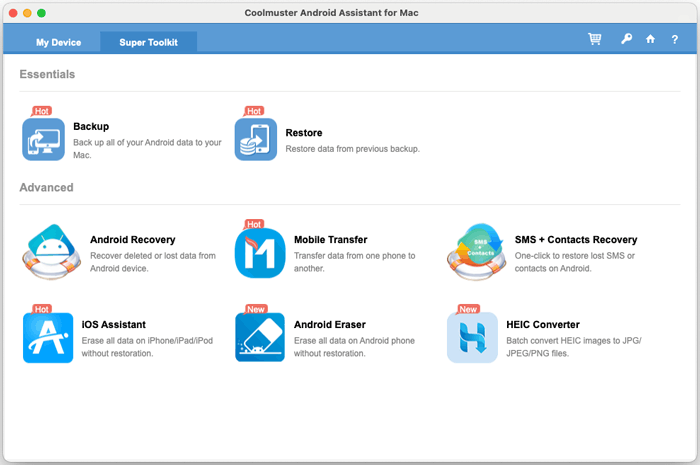 在Mac上安装并启动软件后,使用USB数据线将Android设备连接到Mac 。程序将开始检测您的Android设备。然后进入"超级工具包"部分。