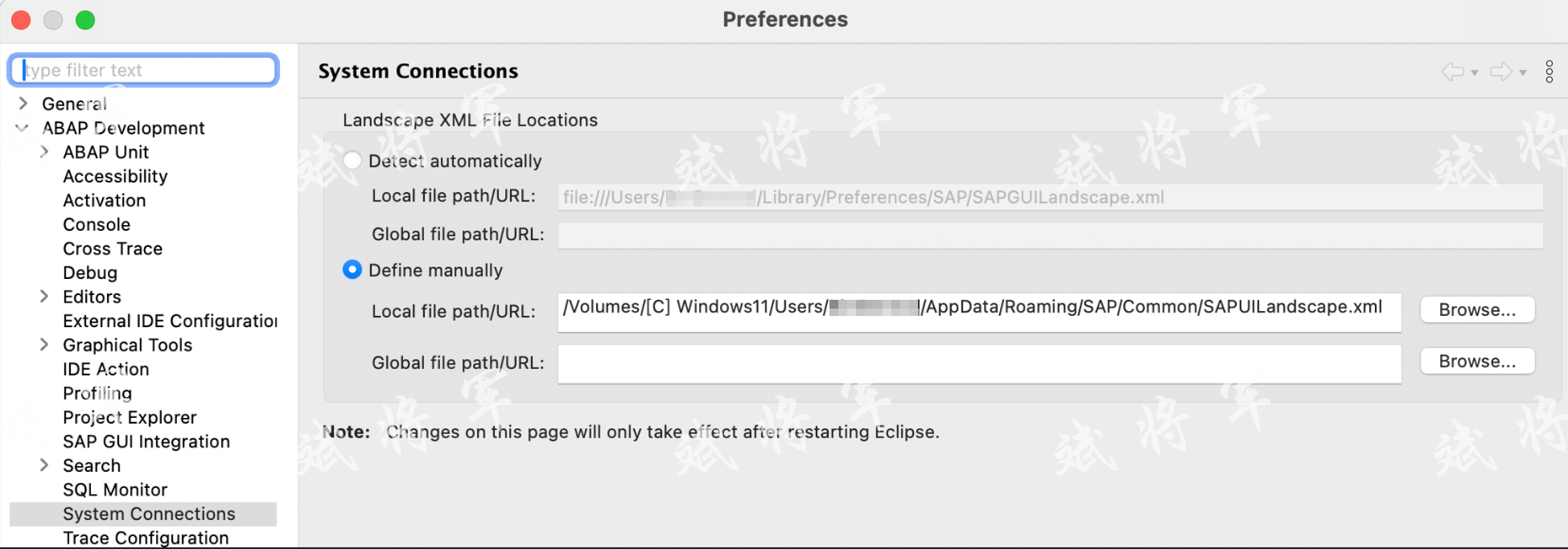 所以可以在eclipse中设置system connections,更换为虚拟机win11中对应的SAP GUI登录配置文件的地址