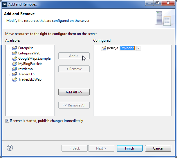 在New Server向导的Add and Remove页面上,在Available列中选择firstejb项目。