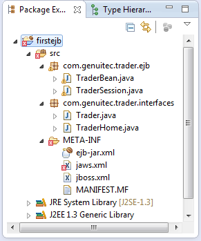 注意:当您在第2节中创建TraderBean.java类时,将其Java包名称指定为com.genuitec.trader.ejb,并强调包名称应该以.ejb结尾。这是因为Standard EJB XDoclet packagessubstitution子任务创建了一个以.interfaces结尾的对应Java包名,并将生成的EJB和Home接口添加到其中。在这个例子中,创建了接口包,它包含了用于Trader EJB和TraderHome接口的组件。如果您没有遵循此包命名约定并使用默认的XDoclet设置,则可能无法生成某些文件。