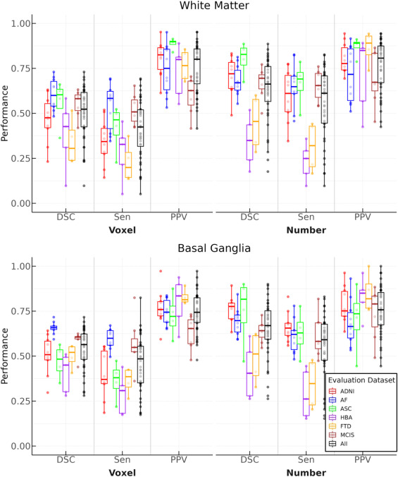 图2.内部验证。PINGU在所有站点数据上训练和评估的性能,包括白质(上)和基底神经节(下),DSC:Dice分数,Sen:敏感度,PPV:阳性预测值/精确度,vox:体素级别指标,num:聚类级别指标。