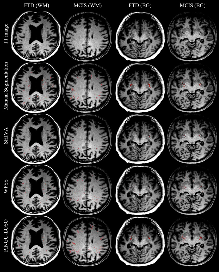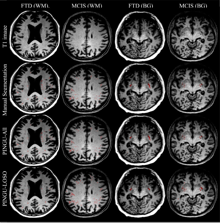 图1.PINGU-All和PINGU-LOSO在T1图像上的叠加,并与"高质量"数据集(MCIS)和"低质量"数据集(FTD)的手动分割进行比较。显示切片是根据手动分割中白质(WM)和基底神经节(BG)中PVS体积最大的切片自动选择的。
