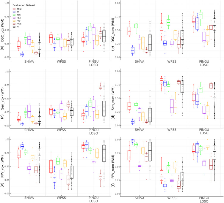 图4.外部验证,算法比较(白质(WM)):在未见过站点数据上评估的算法性能。DSC:Dice分数,Sen:敏感度,PPV:阳性预测值/精确度,vox:体素级别指标,num:聚类级别指标。