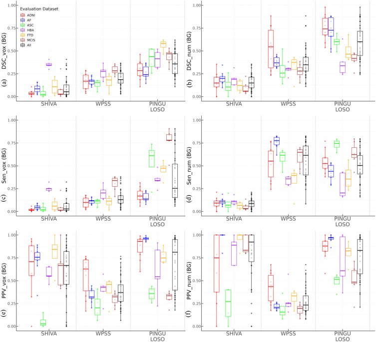 图5. 外部验证,算法比较(基底神经节(BG)):在未见过站点数据上评估的算法性能。DSC:Dice分数,Sen:敏感度,PPV:阳性预测值/精确度,vox:体素级别指标,num:聚类级别指标。