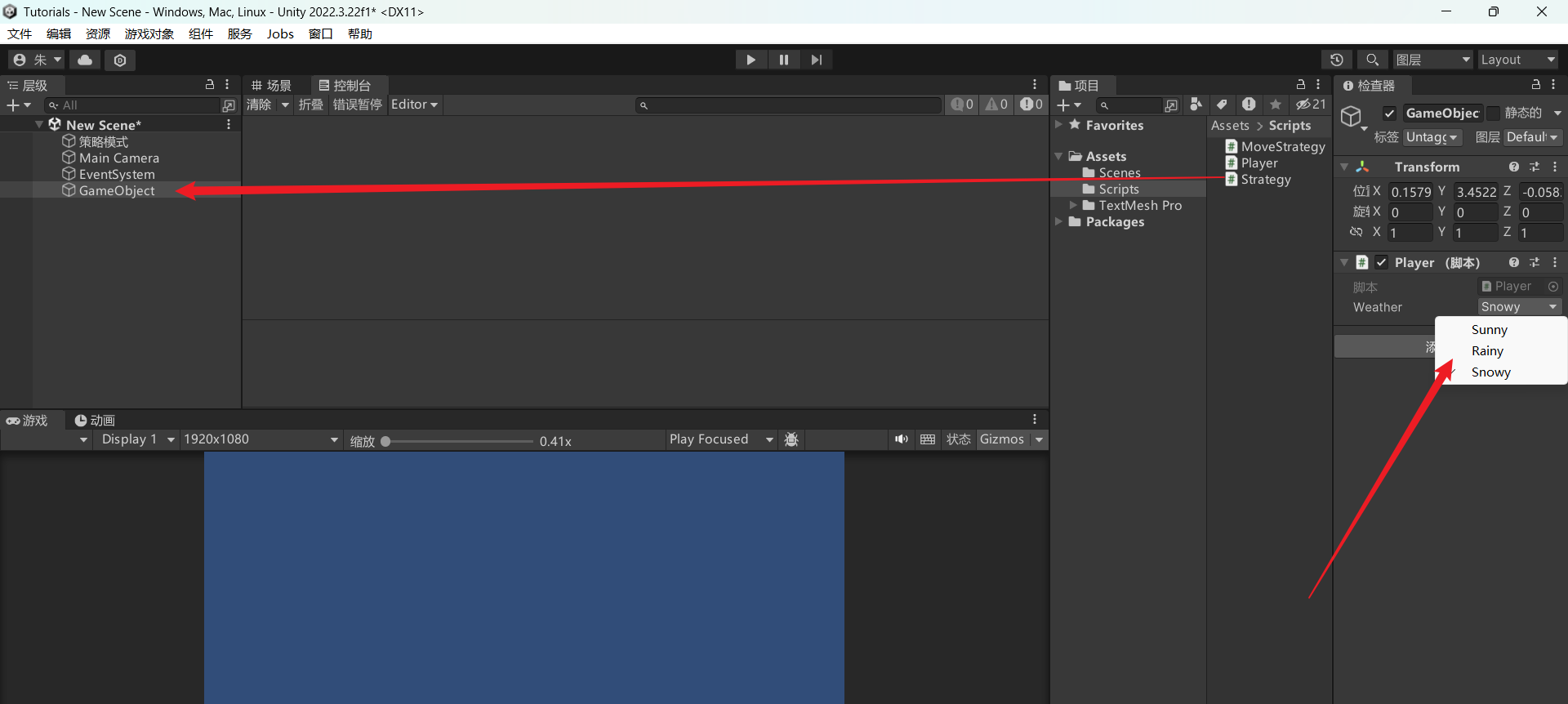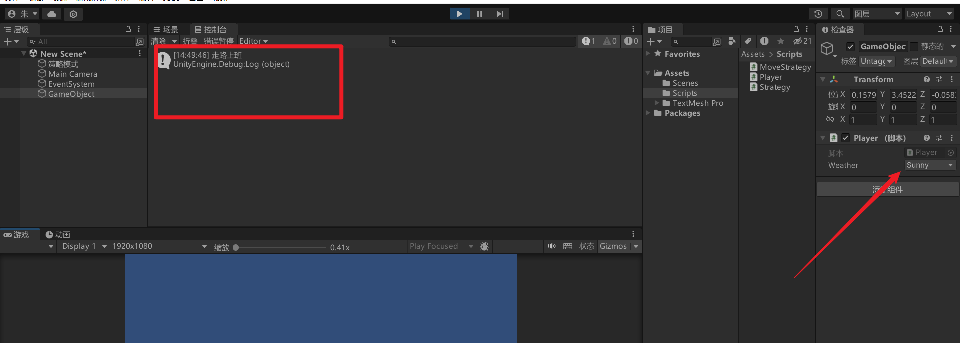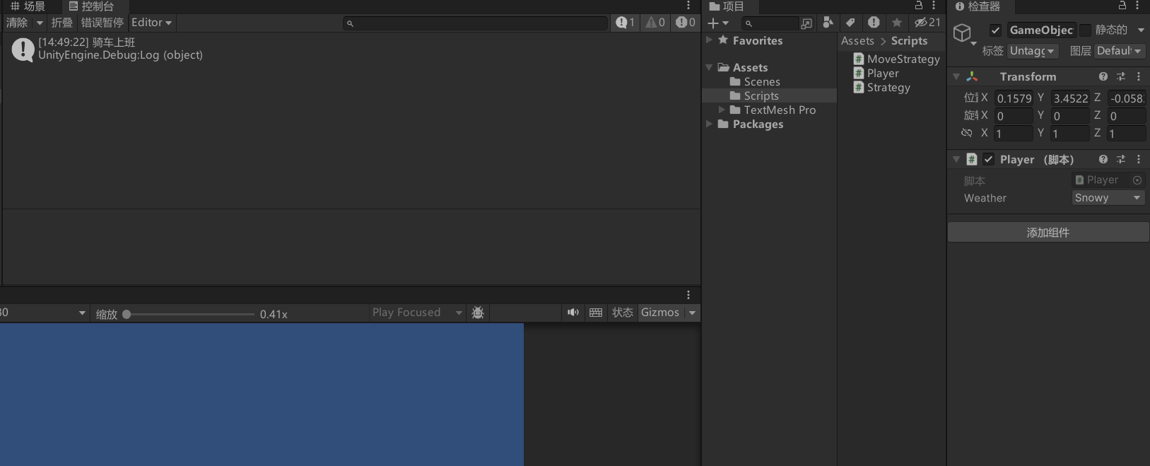 将Player脚本加到场景中的一个空对象上并选择天气然后运行游戏就会发现天气不同打印出来的策略也不同。