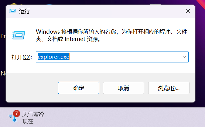 Win+R的组合快捷键调出运行框,输入explorer.exe后回车,单击确定。