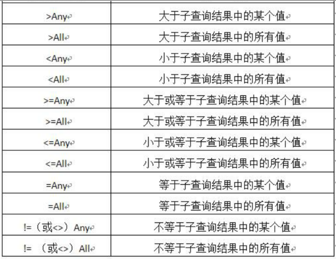 当子查询的结果为单一值时可以用比较运算符,但如果返回的是多值,需要用到谓词 Any(某个值)或者 All(所有值)。Any 或 All 谓词一般与比较运算符配合使用,这种情况下,SELECT 语句的一般格式为: