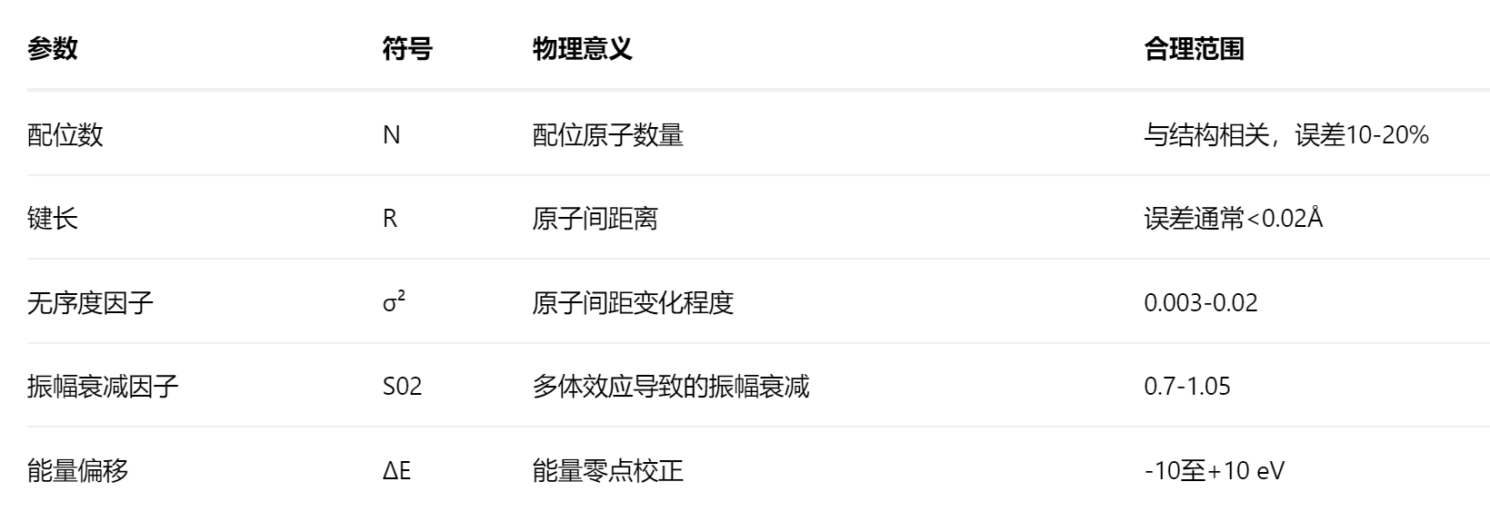参数合理性:ΔE应在-10到+10 eV范围内;σ²必须为正值;同系列样品中同种配位的ΔE应接近