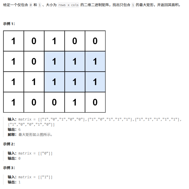 以第一行为底的柱子高度为 [1,0,1,0,0],最大矩形面积为 1。