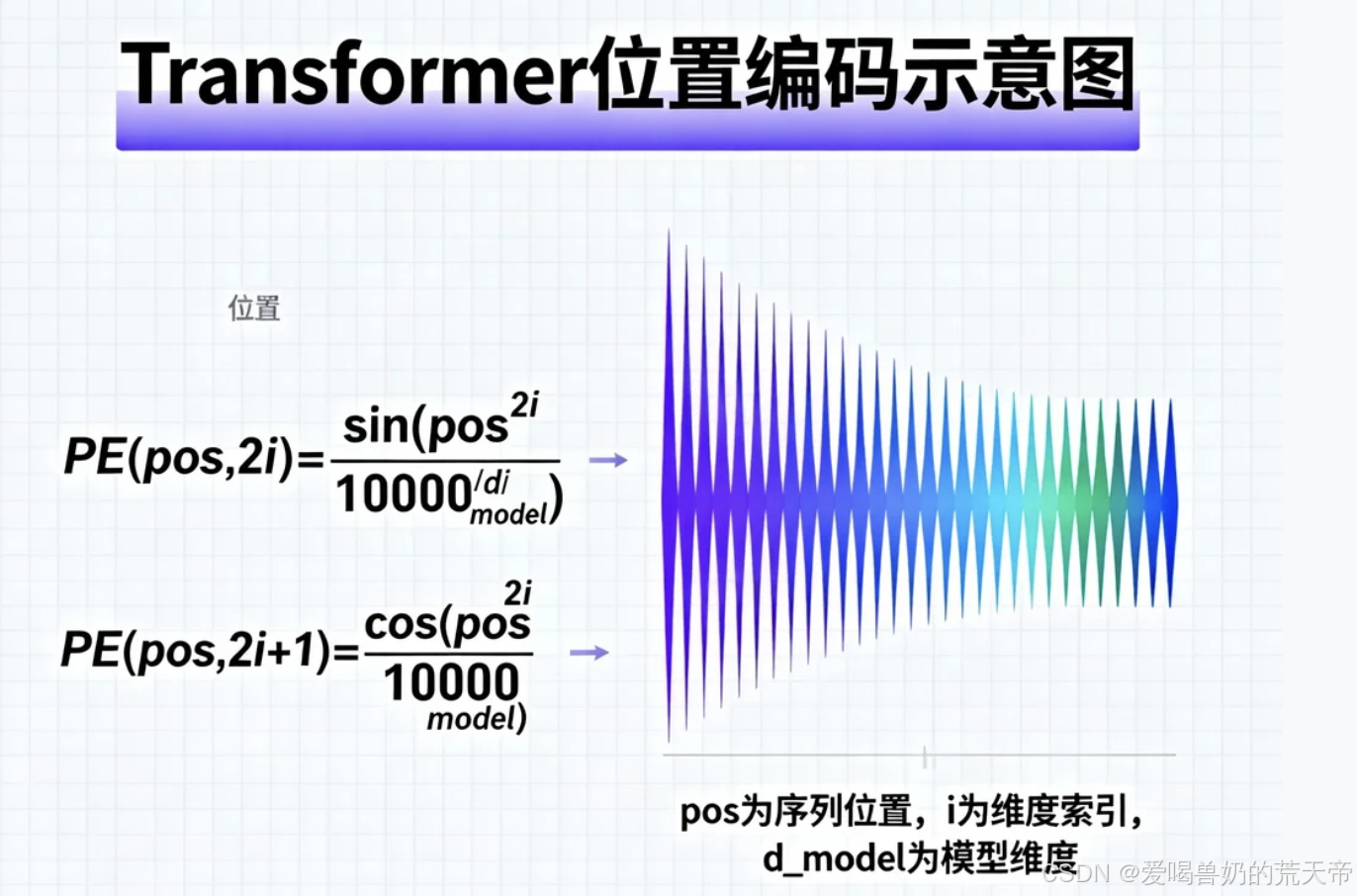 原始Transformer论文中的位置编码设计堪称经典,它采用了一组固定的正余弦函数来生成位置向量: