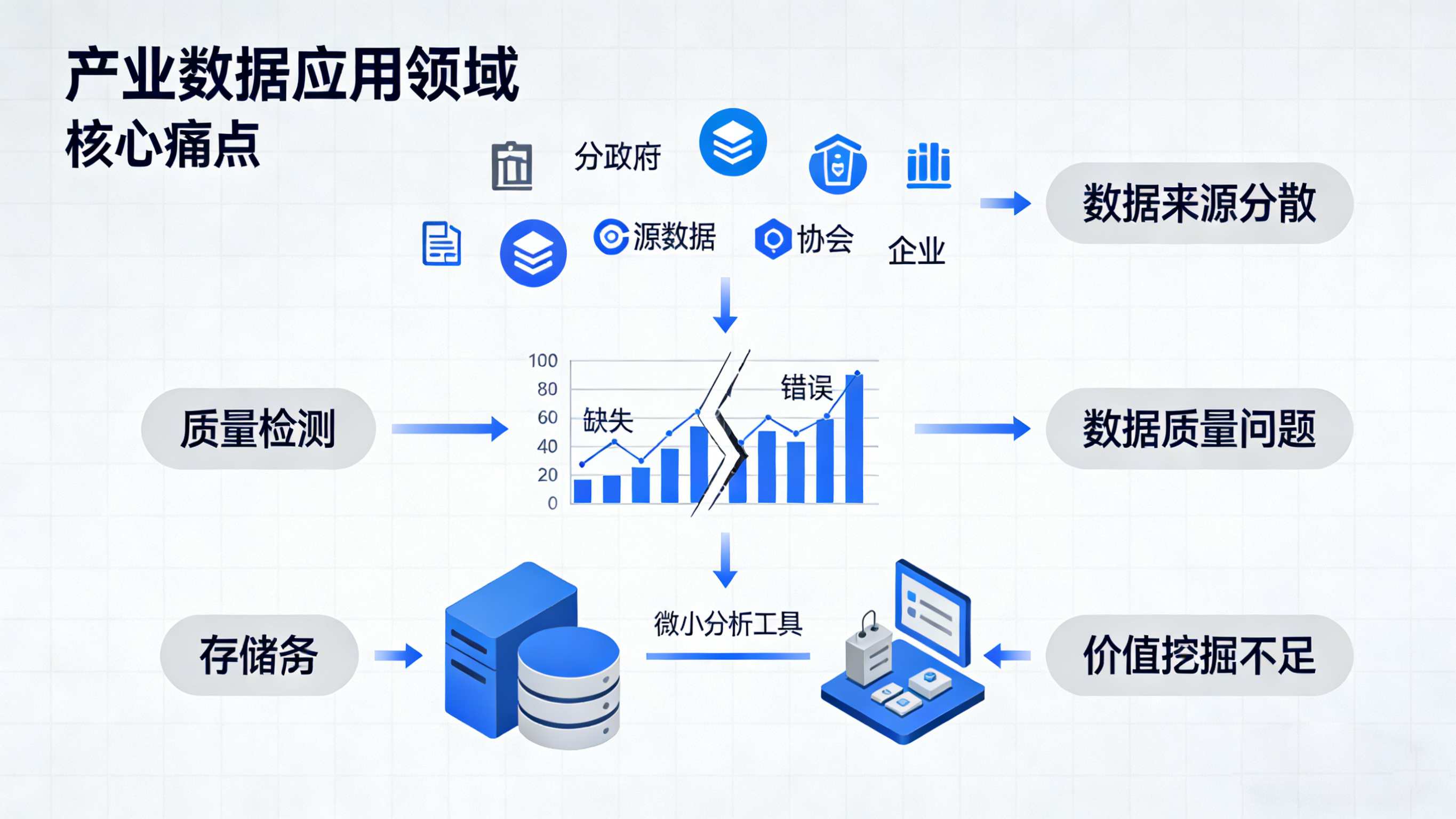 当前产业数据应用领域普遍存在三大核心痛点:一是数据来源分散,政府部门、行业协会、企业主体等多渠道数据格式各异、标准不一,整合难度极大;二是数据质量参差不齐,缺失、错误、滞后等问题频发,难以支撑精准决策;三是数据价值挖掘不足,多数数据停留在存储层面,未形成与产业场景深度适配的分析能力。
