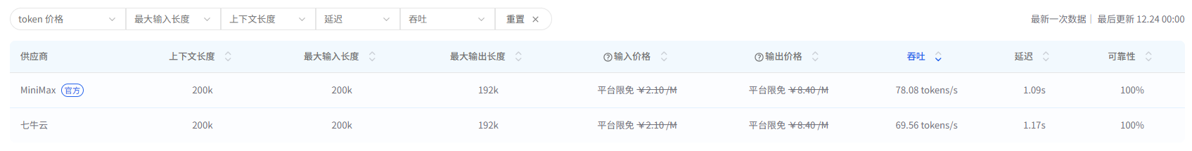 MiniMax-M2.1 的两家供应商官方、七牛云均支持 200k 上下文 / 输入长度、192k 输出长度,可靠性均为 100% 且当前享平台免费额度;其中 MiniMax 官方的吞吐更优(78.08 tokens/s)、延迟略低(1.09s),七牛云吞吐稍弱(69.56 tokens/s)、延迟微高(1.17s),二者性能差异较小,可按需切换。