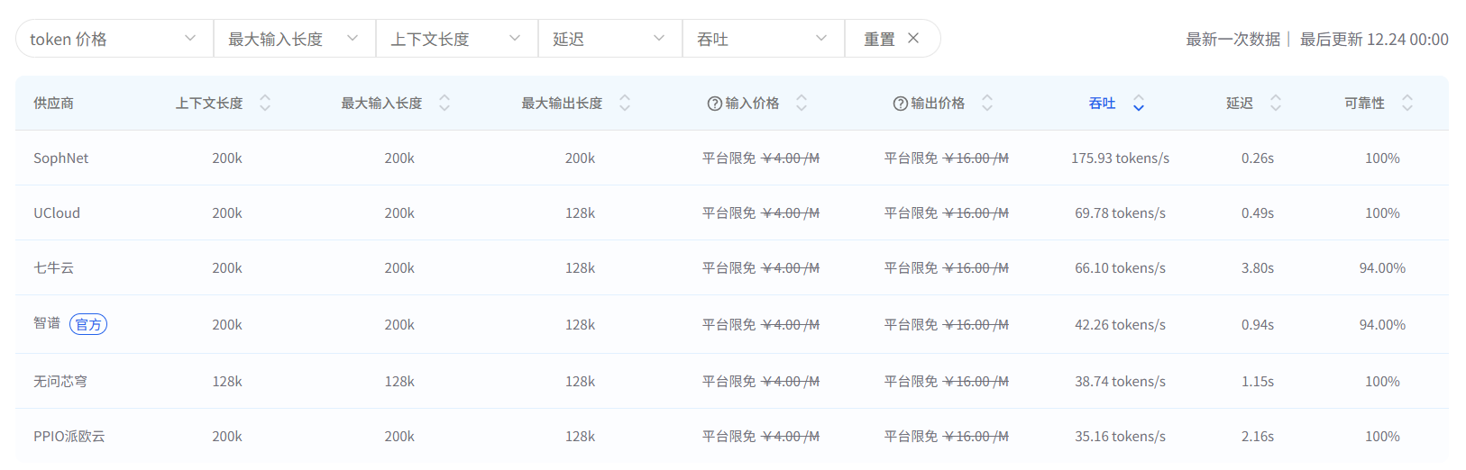 GLM-4.7 各供应商中,SophNet 的吞吐(175.93 tokens/s)与延迟(0.26s)表现最优,上下文 / 输入 / 输出长度均达 200k 且可靠性 100%;UCloud 吞吐、延迟次之;七牛云、智谱(官方)可靠性略低(94%);无问芯穹上下文长度仅 128k 但可靠性拉满,PPIO 派欧云各项指标相对偏弱;当前平台均提供免费额度,输入 / 输出价格一致。